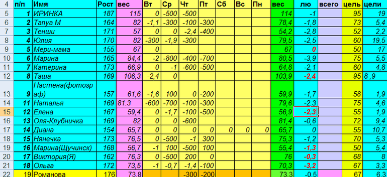 Наши отчеты и результаты:)Всем привет!!!!!!!!!!!! Сегодня выходной у многих (кроме меня), я знаю, что вся семья в сборе, очень тяжело устоять перед вкусняшками! ! Но нам нужно держаться! У меня сегодня -500, я очень рада, что вес немного сдвинулся! А у вас какие отвесики??? вот табличка за вчерашний день, проверьте, не ошиблась ли я!