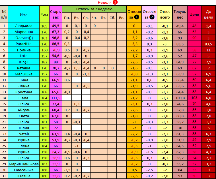 Наши отчеты и результаты:)Доброе утро!!! Как настроение, как настрой, желание похудеть не пропало? Сегодня почистила наши ряды, если прогульщики в конце недели не появятся и им мы тоже помашем ручкой