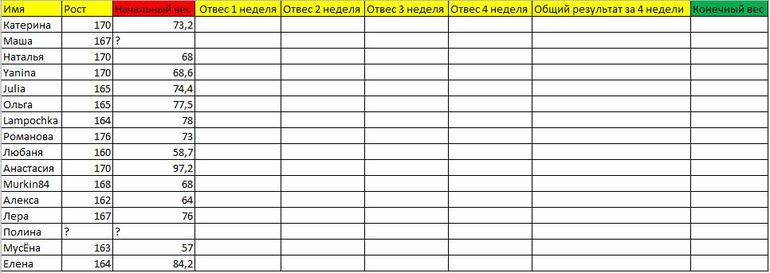 Как обещала выкладываю нашу с вами табличку. Если какие-то данные внесла с ошибкой, пишите. Всё исправлю! Каждый понедельник я буду писать пост в сообщество и вносить наши результаты! Удачи нам всем, девочки!