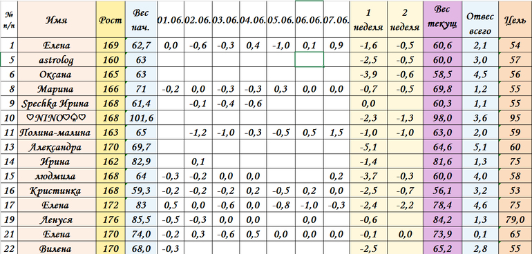 что-то тает наша табличка.) Девчонки, ну что же вы?)) у меня сегодня привес 200 г, на весах опять 70, но я не отчаиваюсь.)) вперед к победе!!) номер 8.)