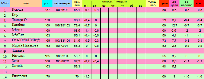Наши отчеты и результаты:)Всем привет! Процесс пошел))) Девчонки молодцы! За 1 день наша команда сбросила в общей сложности 4,7 кг!!! Жду отвесы за вторник.