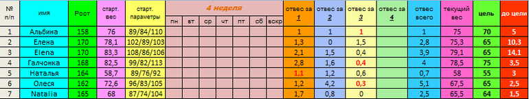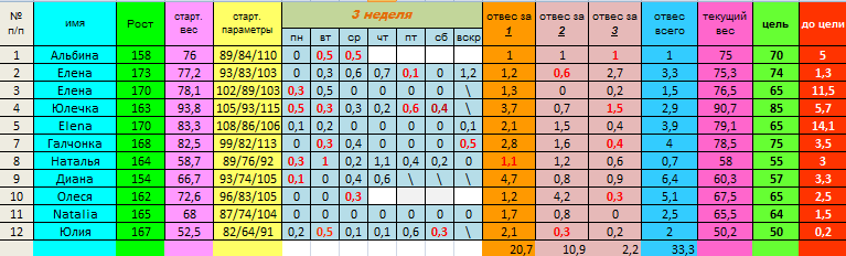 Третью неделю прошли 12 девушек из 17-ти (со второй недели). К началу четвёртой недели нас осталось семеро из 26-ти (в начале марафона). Так горжусь вашим упорством и настойчивостью в достижении цели! Вот честно, МОЛОДЦЫ!!!