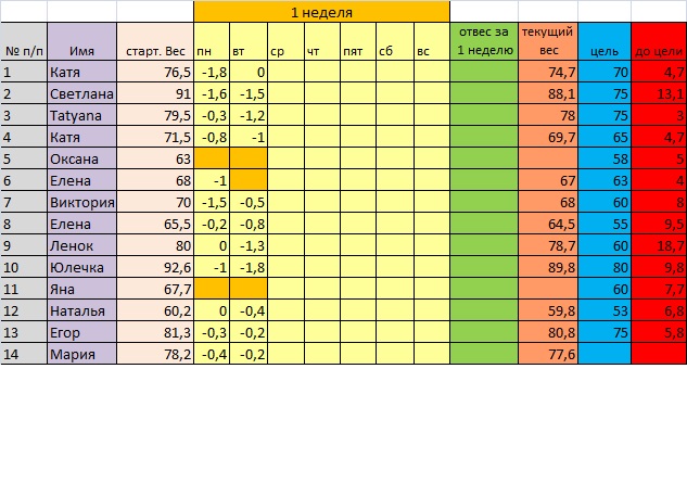 12. Наталья отвес-400. Текущий вес 59.413. Егор отвес-100. Текущий вес 80.7