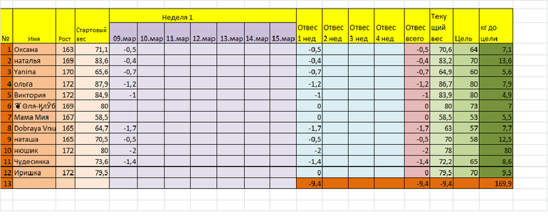 Оксаночка дорогая исправь у меня #3 стартовый вес 65,5 а не 65,6. Сегодня -0.4, вес утром 64.4.