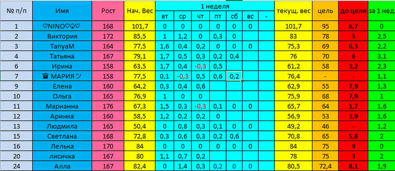 Наши отчеты и результаты:)Девочки, первая неделя почти позади. Пишите ваш номер и отвес. Я сегодня буду косячить, так что завтра буду в плюсе(((