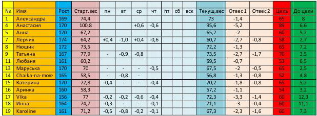 Присоединяюсь к благодарности других) Моя строка нуждается в исправлении: № 14, четверг -0,1, текущий вес 56,3.