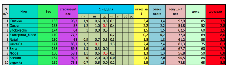 Итак, таблица. У меня просьба: в комментах пишите, пожалуйста свой номер и отвес, а не свой вес, так мне будет намного быстрее заполнять таблицу. Заранее спасибо!