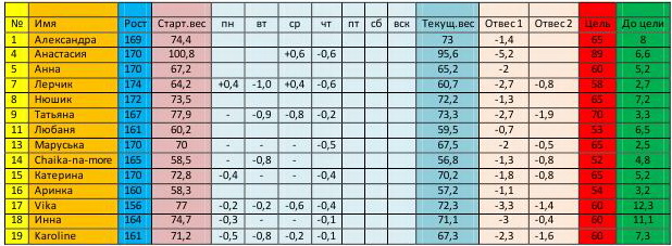 Девочки, всем привет! прошу у всех прощения что исчезла и не могла продолжать нашу таблицу....... у меня бабушка умерла....поэтому пришлось уехать, и сами понимаете что в такой ситуации времени не было даже отписаться .... Девчонки надеюсь вы на меня не в обиде....уверена что вы все дойдете до победного конца , и будите выглядеть ещё стройнее и красивее!!!! Всем удачи......