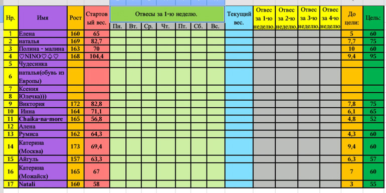 Запишите, пожалуйста и меня. Тоже начала в понедельник. Рост 158,нач.вес 62,3.Поставьте мне 0,т.к.вставала на весы сегодня раз 5 и каждый раз показывал разный результат, решила поменять батарейку. Завтра напишу отвес за два дня. Я на творожном варианте (кормлю грудью)