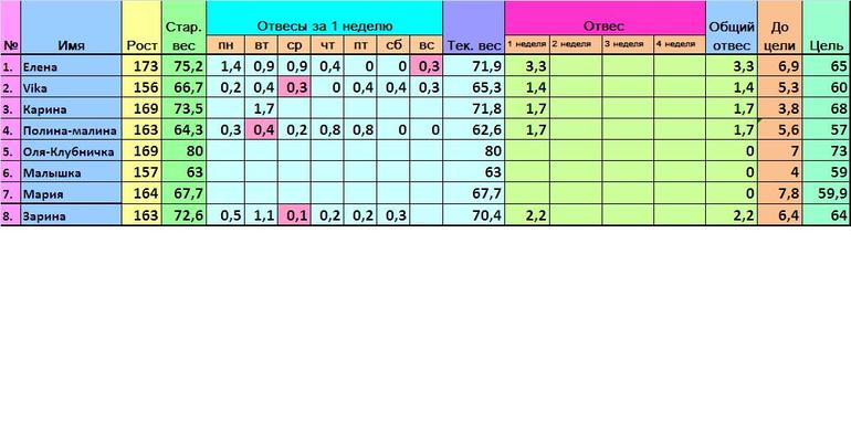 Привет! Да, нас с каждым днем все меньше) обычно каждые выходные прям заметно худеет табличка..) Жаль, что табличка, а не девочки, которые уходят.. У меня получается с этой недели начался второй круг! Огого, даже не верится) Вика, мне пока по нулям ставь, в конце недели взвешусь :)