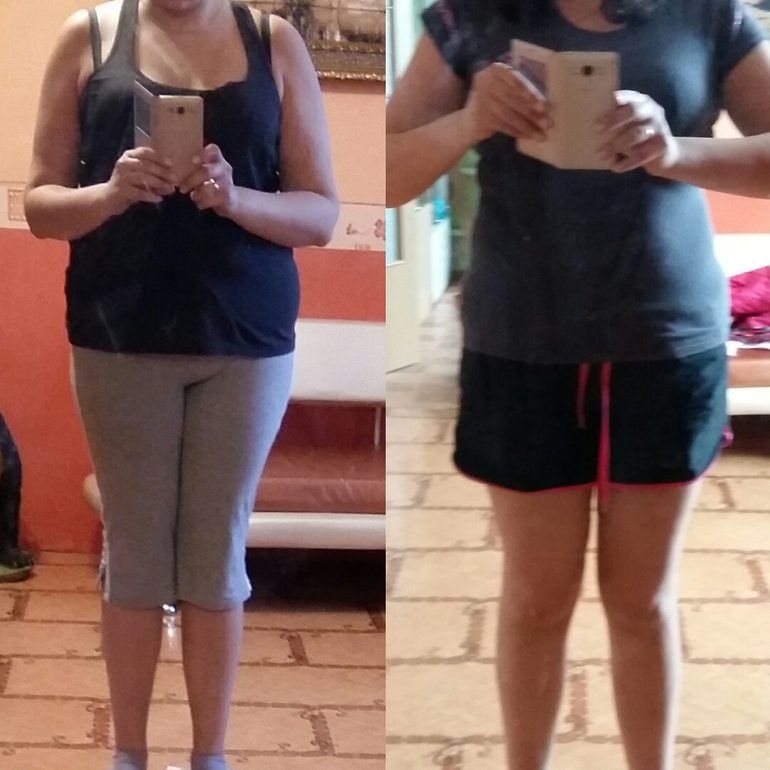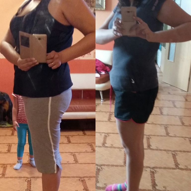На фото в серых штанах это день начала Магги, на фото в чёрных шортах спустя 3 недели, т.е. сегодня.