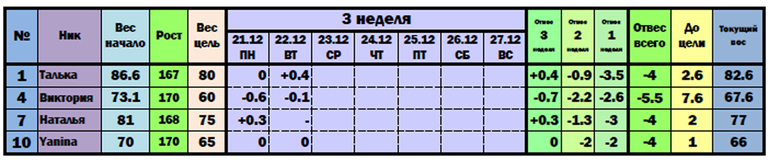 Привет,№7,вес 76 ровно.У меня ещё кд на носу,так что думаю вес стоять будет,хоть бы к Новому году 75 быть,в идеале 73 хочу.Потому что 2 кг после диеты вернутся 100%.Это вода,у большинства так,я читала.