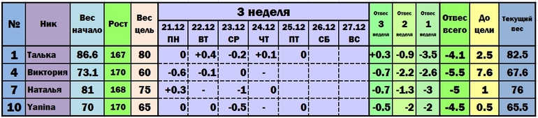 ПРИВЕТИК ДЕВОЧКИ У МЕНЯ ТАКЖЕ ПО НУЛЯМ!!!СЕЙЧАС БЫ УДЕРЖАТЬ СВОЙ ВЕС КОТОРОЙ Я ДОСТИГЛА !!!!ВСТРЕТИМСЯ В НОВОМ ГОДУ!!!!С НАСТУПАЮЩИМ ВАС НОВЫМ ГОДОМ ОСТАВАЙТЕСЬ КРАСИВЫМИ ЗДОРОВЫМИ ДЕВОЧКАМИ ,ТАК ЖЕ ЖЕЛАЮ ВАМ И ВАШИМ ДЕТКАМ ЗДОРОВЬЯ!!!