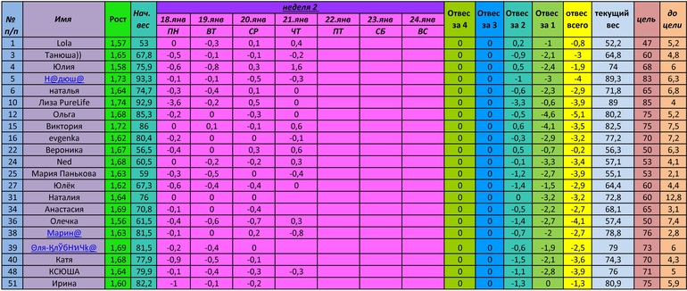 Привет всем! Как видно из таблички, что все расслабились, но ничего страшного, дольше худеть будем)))