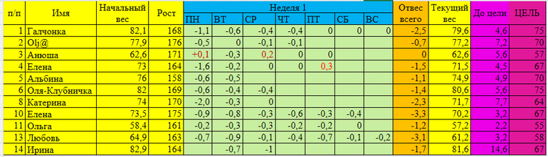 #13 Всем привет! Я вернулась. В таблице ошибка. Уезжала с весом 61.8 64,9-3.1=61,8 До цели 3,8