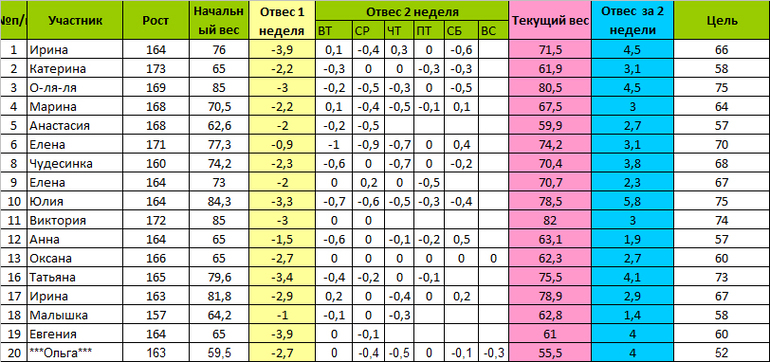 Привет всем! сегодня -200, текущий 74,0. И я всей нашей компании говорю спасибо! вместе веселее) а то я товарищ совсем не дисциплинированный и легко поддающийся гастрономическим соблазнам)) Если бы не наша группа, наверное бы бросила после первой недели. а так с "косяками", но держусь)) чего и всем желаю) № 6