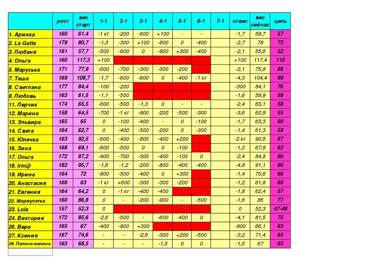 Арин, я же не с первого дня взвешивалась,когда на мех весах взвешивалась в среду было 71, 5, а на след день на электронных показало 72, получается в четверг результат потерян. в пятницу утром было 71,7, а в субботу 71,9.