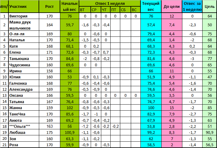 Всем привет! Ольга,исправьте мне, пожалуйста, в табличке, немножко неточность #10. Начальный вес 53,200, а текущий 52,100. Сегодня ноль.