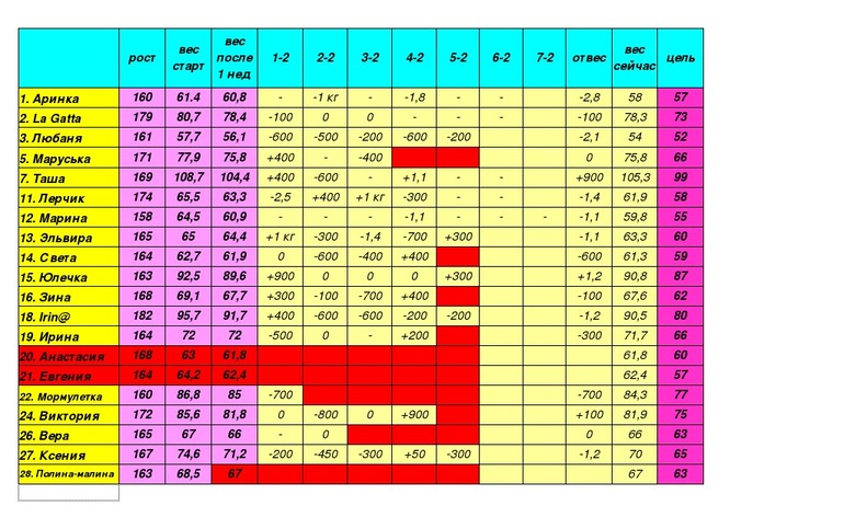 всем доброго дня)))) №27(-300) вес 70 кг. надеюсь на этой недели я увижу цифру 69))))