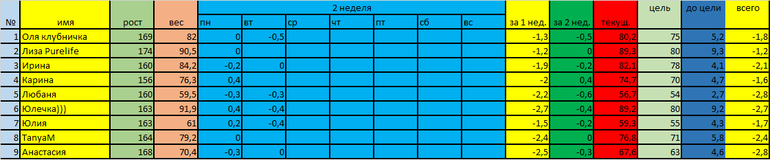 привет.номер 8. в понедельник был привес 0,4(косячила в воскресенье).итого вес.77,2. вторник-отвеса нет. и сегодня тоже. тоже жду КД(может из-за них вес встал, хотя конечно странно,что вес стоит-я и бегаю, и упражнения для живота делаю, плюс кофейный скраб и обертывания с горчицей и медом, а потом домашний массаж).