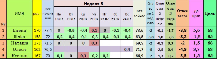 По результатам первых трех недель лидерство прочно захватила ilinka с результатом - 8,2 кг!!!! Поздравляем, большая молодец, ни одного дня без отвеса, девочки, равняемся на ilinka!!! На втором месте Олеся, несмотря на то, что неделю не отчитывалась и даже получился плюс в конце недели, на третьем месте я, со скромным результатом в - 3,8 )) ВСЕ МОЛОДЦЫ, держимся и стремимся к вершинам!!!