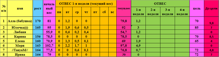 Наши отчеты и результаты:)Всем привет Как ваши успехи?Пишите ваш отвес и тек.вес на сегодня. Девочки, проверьте табличку.