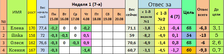 Наши отчеты и результаты:)Привет всем!!! Девочки, наступили выходные, держимся, особо не срываемся, не зря же боролись с весом неделю!!!! Всем отвесов!!!