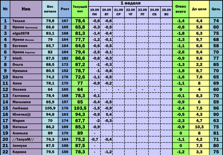 Наши отчеты и результаты:)Привет! Девчонки, вы такие умницы! Так приятно, что почти все в эти сложные первые дни на месте)) Вы представляете, мы вместе за один только понедельник скинули 17,2 кг! Обалдеть!))) Осталось еще всего каких-то 154,3 кг