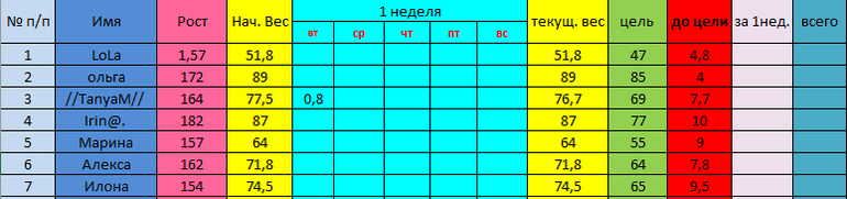 Всем привет, а возьмите меня к себе)))рост 168, начальный вес 77,8; за понедельник -400, текущий вес 77,4; цель 70