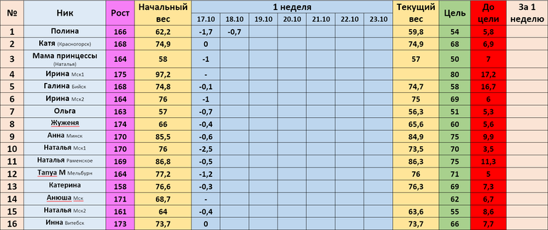 Если еще не поздно, добавьте и меня в таблицу, пожалуйста. Я тоже начала с понедельника, но одной скучновато. Начальный вес 84 при росте 172. Цель 72. Текущий вес 83.1.