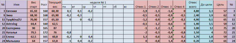 Я в общем имела ввиду,там вроде Евгения собиралась. У меня эта неделя совсем плохо идёт,+- 200гр туда-сюда ходит. А в целом,от начала,не плохой результат получился ( 69.9....61.9)