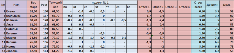 лен, привеи, держи данные .... очень хочу в вашей табличке быть. Сижу строго! Без косяков. Рост 164, вес начальный 83. Отвес за первую неделю 5300. За вторую 1700.