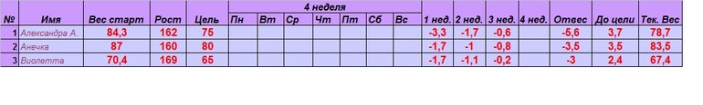 Наши отчеты и результаты:)Привет, худышки! Последняя неделька идёт, как вам на ней? не голодно? Не переедаете? Я стараюсь не переедать, дабы на следующей неделе не страдать)) Ещё думаю попробовать творожный вариант на следующей недельке. Табличку сделала, у меня получилось так, если у кого-то что-то не так, то скажите - исправлю))