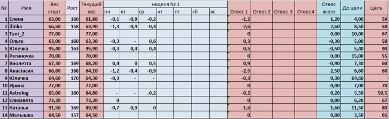 Ну и наша табличка...почищу ее в понедельник, уберу тех кто не отчитывается)