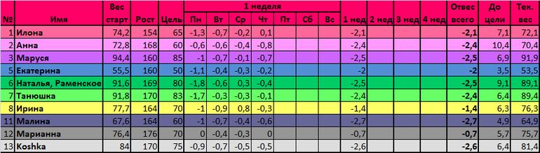 Наши отчеты и результаты:)Ой, честно говоря, мне даже и стыдно, веду табличку, а еще и привесик отхватила, на фоне таких замечательных результатов. За то горжусь, что веду табличку для таких старашечек!