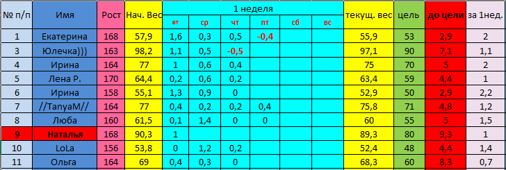 Наши отчеты и результаты:)Всем привет. Пишем номер, отвес и текущий вес. Девочки, еще чуть-чуть и закончим первую неделю.