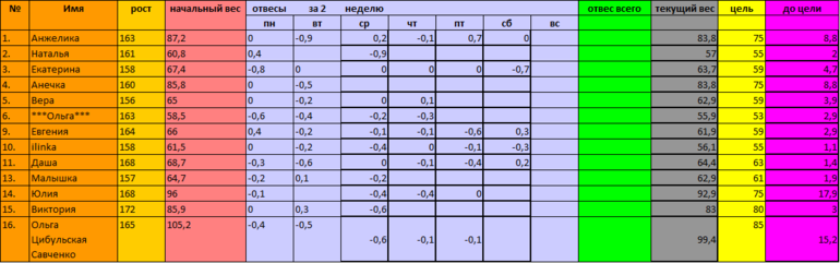 Наши отчеты и результаты:)Доброе утро мои красавицы!!!! Входим в обычное русло... таблицы каждый день без задержек))))) питание по Магги)))) Ура я на работе!!!! Девочки не знаю как Вы а я ооочень устаю от больничных.... Жду отвесиков.... табличка готова... если ошиблась пишите... исправим... дополним....