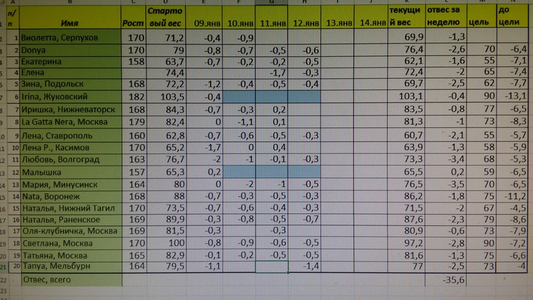 Привет,номер 20 .на сегодня вес 77,0. отвес 1,4.