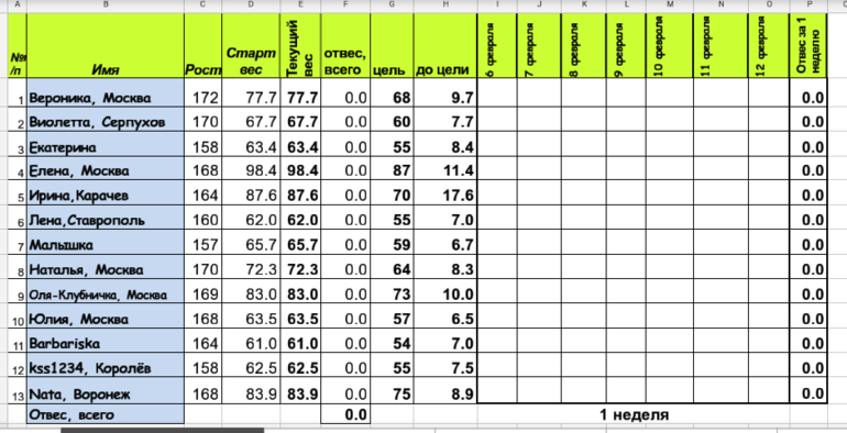 Утром взвешиваемся и кидаем мне циферки (текущий вес и отвес). Старайтесь мне отчитываться днём, табличку свожу в 18 часов, после мне некогда.