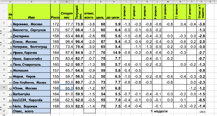 Первая неделя прошла замечательно. Все вместе мы стали легче почти на 30 кг!!! Какие же мы молодцы! Но это не повод останавливаться, правда?