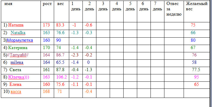Девочки, у меня на сегодняшнее утро 70,1 кг, минус 500гр.А табличке укажите, пож-та, желаемый вес 65 кг.