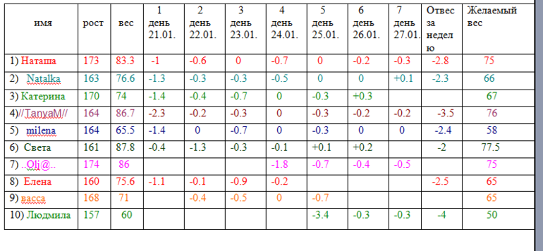 Наши отчеты и результаты:)Доброе утро всем! Наша итоговая табличка здесь и в другом посте будет уже 2 неделя,так что комментируем только здесь,чтобы я не запуталась с таблицей У меня сегодня -300.За неделю ушло 2.8,вес 80.5.Первый раз у меня так мало ушло,обычно по 4-5 кг на первой неделе уходило.Девочки продолжаем !!!