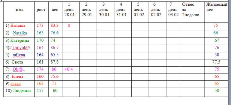 Да, надо добавить еще столбик! Какие у кого успехи за первую неделю, а то по табличке получается, что стоим на месте(