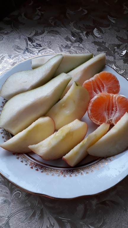 я на завтрак съела три малюсенькие груши и мандаринку,на обед будет хурма,а на ужин помело наверно куплю