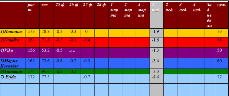 Наши отчеты и результаты:)Привет всем!Пишу теперь посты поздно,так как в комнате ,где комп стоит спит сын,а он фиг знает до скольки просидит в компе,а потом дрыхнет )))