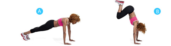 Довольно сложное упражнение, но крайне эффективное. Станьте в упор лежа (А), затем изо всех сил вытолкните ваши ноги и ягодицы вверх (В). Вытолкнитесь так высоко, как только сможете. Если, поначалу, у вас будет плохо получаться, не отчаивайтесь, делайте так, как сможете, «Москва не сразу строилась».