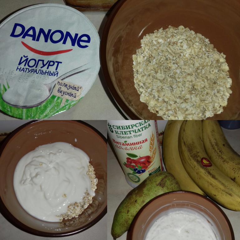А это мой завтрак. вечером овсянку заправить натуральным йогуртом, а утром добавить клетчатку и фрукты.