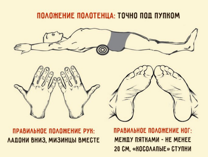 - Аккуратно опуститесь на спину, придерживая валик руками так, чтобы он оказался точно поперек тела под поясницей - ровно под пупком. Это важный момент.