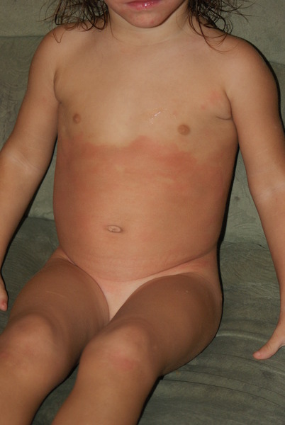 а сегодня ночью дочка проснулась от того что обкакалась. а когда передевала увидела что весь живот в волдыря. они не чешутся не беспокоят. на данный момент волдыри прошли но осталось красное пятно.выглядит как ожог. аллергий нет. вчера не гуляли. не ели нового... порошок, все умывальные. все старое.