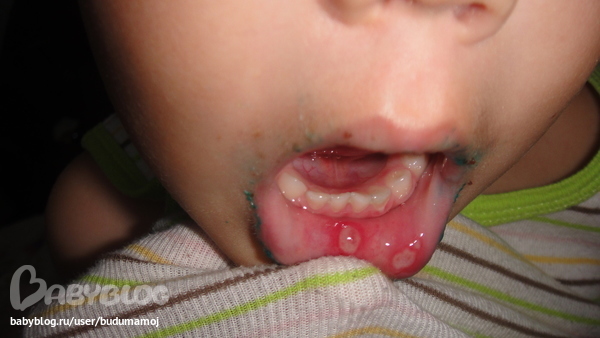 пару раз просыпался и плакал спрашивала что плачешь молчал молчком. в среду утрм чистим зубы, обнаруживаю язвочку, такие бывают когда губу прикусишь, болючие такие, думала ну губку прикусил в саду или может упал, пока игрался, а меня не предупридили, тем более муж из сада забирал, может и не спросил. Забираю вечером из сада, говорят плохо ел. жаловался, что болит. Пришли домой, ближе ко сну поднялась температура 38,6, сегодня соответственно мы дома, и вот что имеем. 3 язвочки на губе, остальные поверхности чистые, имею ввиду и язык и небо и остальная внутренняя поверхность щечек. Сталкиваюсь первый раз с подобным, вся надежда на вас. в поликлинику ити бесполезно, кто живет в Балашихе знает, а на дом к "неместным" они не приходят, уе 150 раз мне такое рассказывали, так что будем лечиться сами. Ниже фото. На ночь мазала зеленкой, поэтому ротик зеленый, да и съел киндер поэтому крошки, на это не смотрим. и чем это лечить? Темпа с утра 37,6.